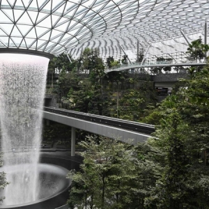 Singapur vuelve a sorprender al mundo con un impresionante edificio de 134 mil metros cuadrados que acoge la «Rain Vortex», la cascada interior más alta del mundo que por la noche se transforma en un espectáculo de luz y sonido.