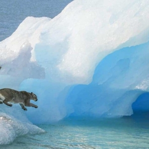 Captan en video un puma sobre un témpano de hielo en medio de un lago